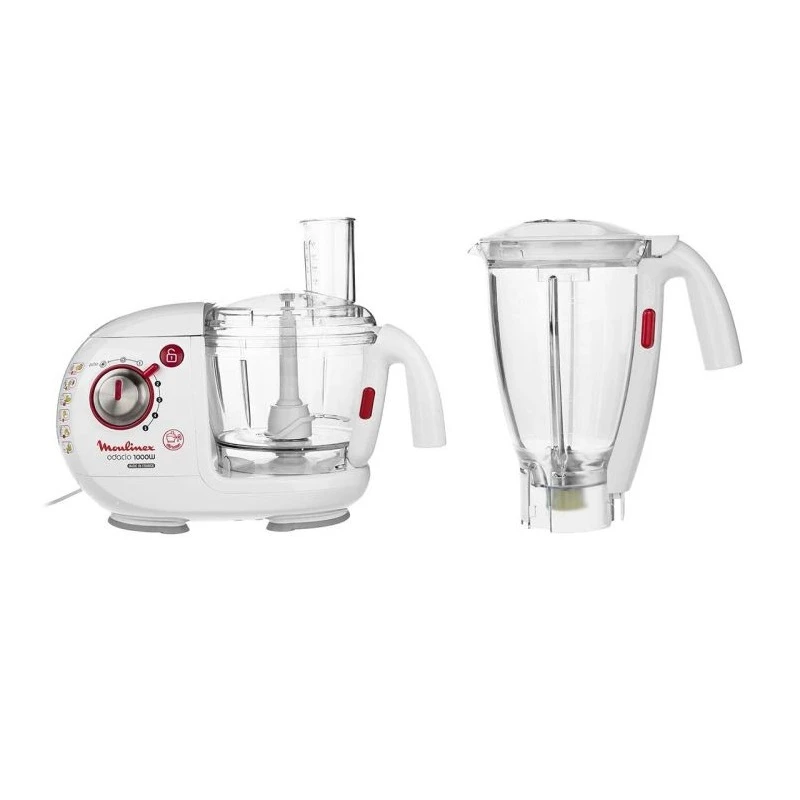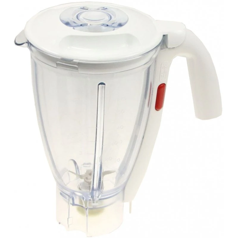 پارچ کامل غذاساز مولینکس از جنس بدنه طلق و تیغه استیل ضد زنگ و کوپل زیر پارچ از جنس باکالیت فشرده می باشد. این مدل پارچ غذاساز مولینکس در مدل های قدیمی با دکمه طوسی عرضه گردیده است و چون سرس جدید غذاساز های مولینکس ترکیب سفید و قرمز است دکمه به کار رفته در این پارچ غذاساز مولینکس به رنگ قرمز عرضه می گردد. نکات ایمنی: در ابتدای استفاده و زمانی که مواد افزودنی درشت هستند چندین بار به صورت لحظه ای از دکمه PULS استفاده نموده تا مواد کمی نرم شده و سپس از دور های 1 یا 2 و … استفاده گردد.(در غیر این صورت به مرور زمان ممکن است طلق شکسته و یا کوپل سر موتور و یا کوپل زیر پارچ دچار آسیب دیدگی گردد) بعد از استفاده جهت شستشو پارچ مخلوط کن غذاساز مولینکس 2قاشق غذاخوری مایع ظرفشویی و یک لیوان بزرگ آب داخل پارچ ریخته و دستگاه را روشن کنید تا جایی که کف حاصل شده از مایع ظرفشویی حداقل تا وسط پارچ بالا بیاید،سپس اقدام به آبگیری نمایید.(در غیر این صورت به مرور زمان به دلیل تجمع مواد غذایی بین تیغه و بوش واسطه باعث خرابی بوش واسطه و نشتی میگردد)